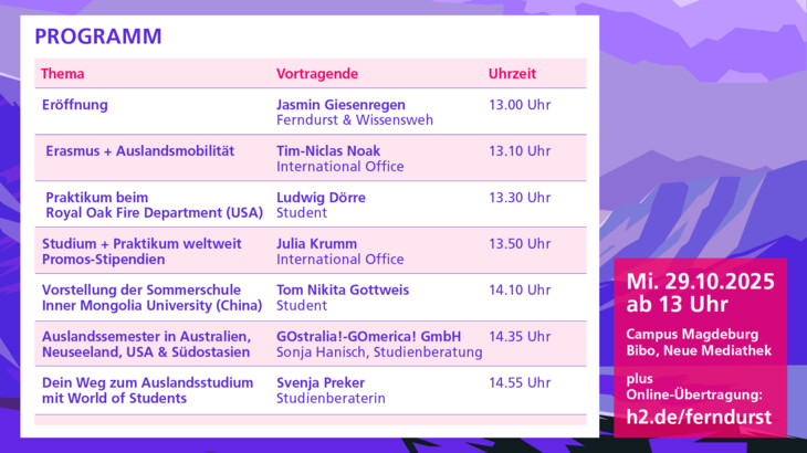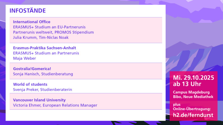 Von Studierenden der Hochschule Magdeburg-Stendal organisiert, lädt die Reihe "Ferndurst & Wissensweh" zu interessanten Vortragsabenden und Infotagen zum Thema studienbezogene Auslandsaufenthalte ein. Die studentischen Vortragenden berichten über ihre Auslandsaufenthalte, die Suche nach dem passenden Studien- oder Praktikumsplatz, Finanzierungsmöglichkeiten, Reisevorbereitungen und natürlich auch über Land und Leute. Außerdem gibt es Beiträge des International Office, verschiedener Auslandsorganisationen sowie Informationen über Stipendienprogramme.