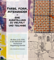 Vom 13. Januar bis 26. Februar 2026 sind im 1. Stockwerk der Hochschulbibliothek am Standort Magdeburg künstlerische Werke zu sehen, die in mehreren partizipativen, kreativen Workshops mit Menschen mit unterschiedlichen Einschränkungen entwickelt wurden.