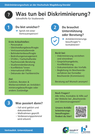 - Wir hören Menschen zu, die Diskriminierung erleben oder erlebt haben und unterstützen sie, die richtigen Ansprechpartner*innen zu finden.